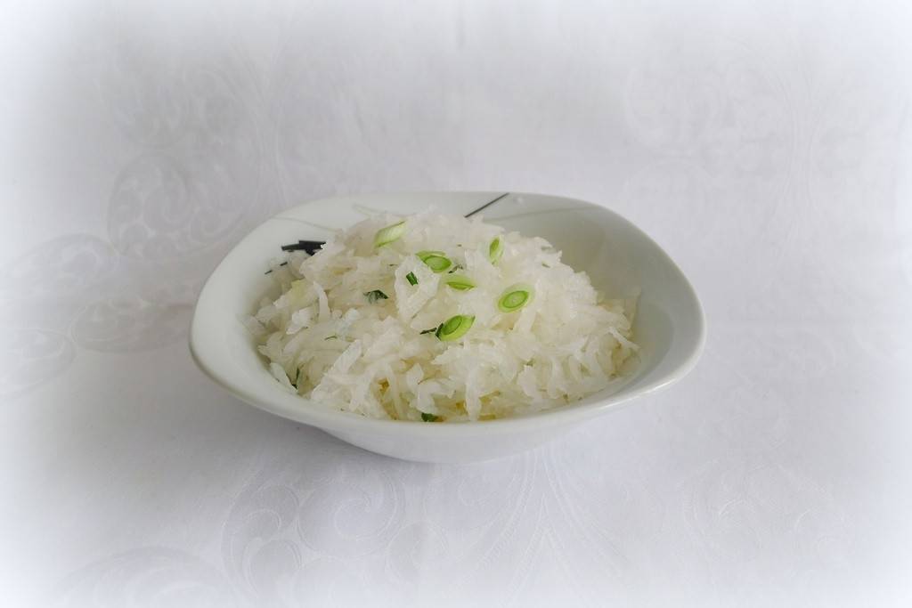 Auch mit einem Joghurtdressing schmeckt der Rettichsalat mit Jungzwiebel hervorragend.